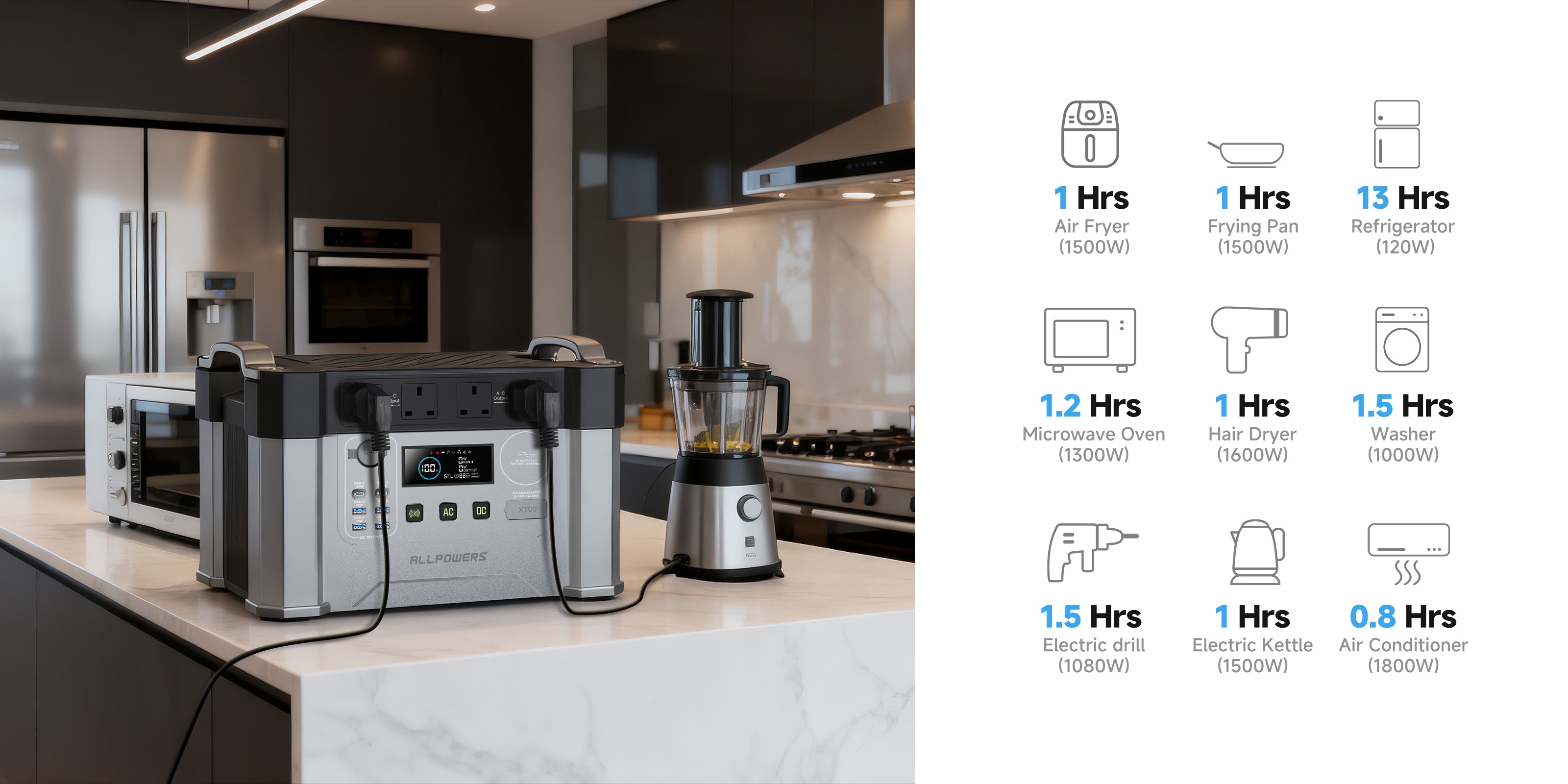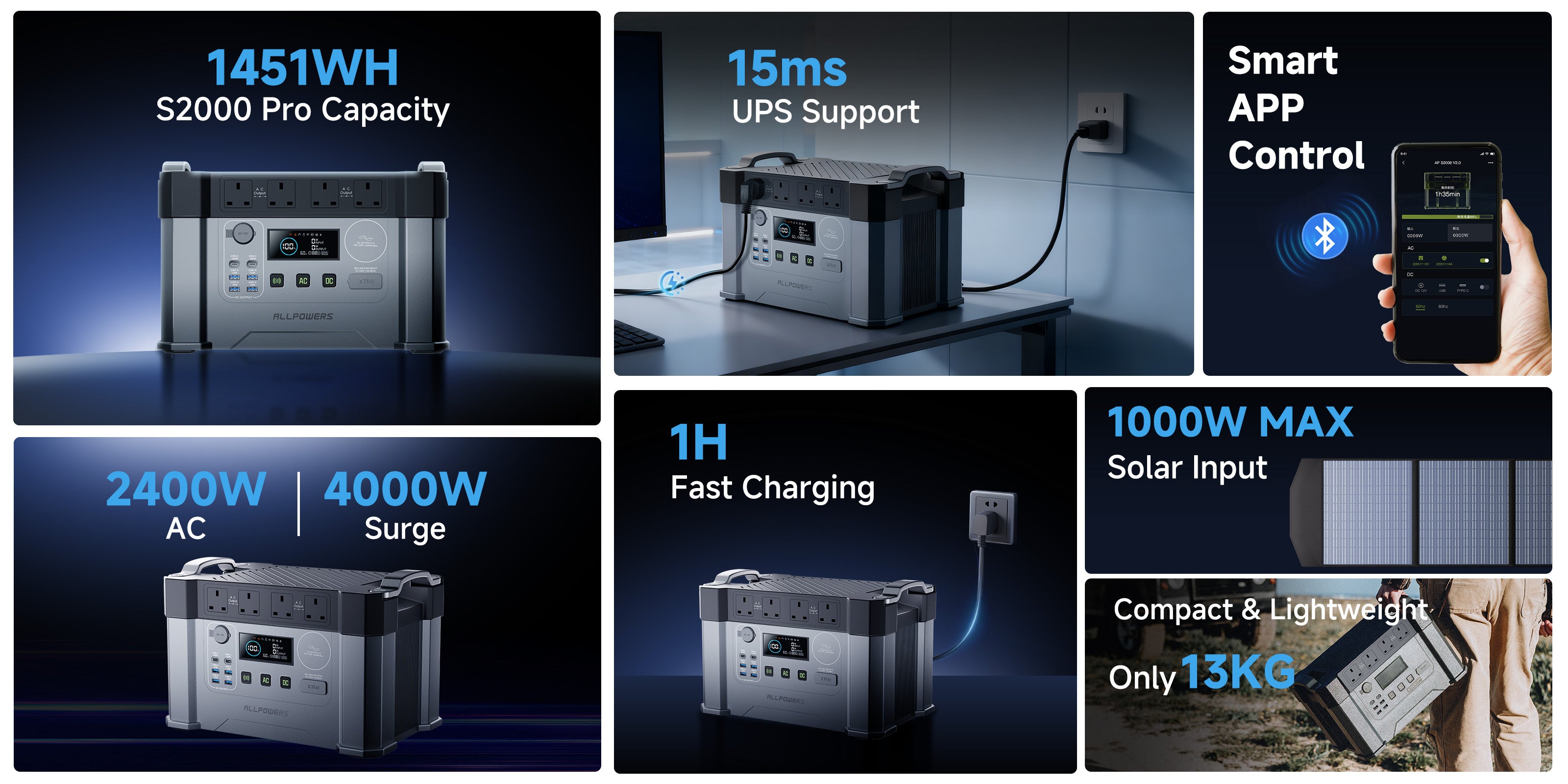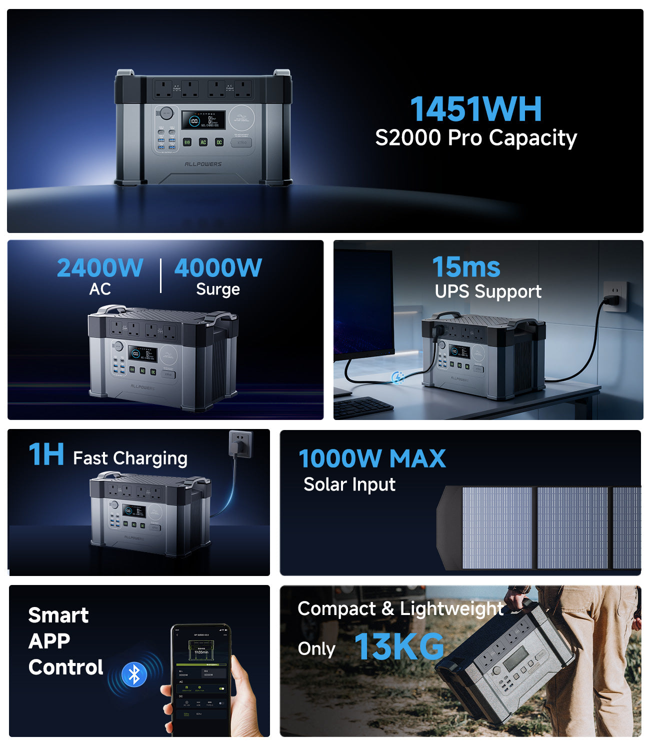 The S2000 Pro has a 2400W AC output (4000W peak), allowing you to power devices with a rated power of up to 2400W and a peak power of up to 4000W.