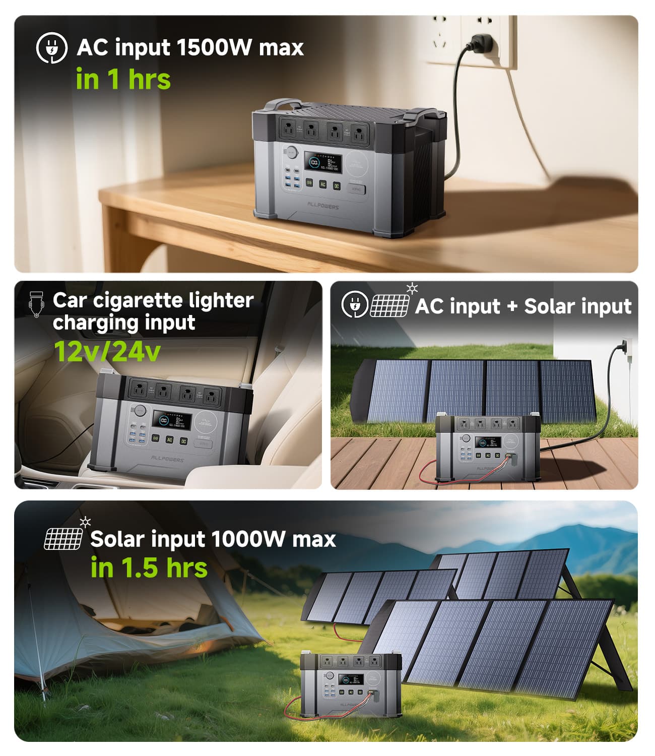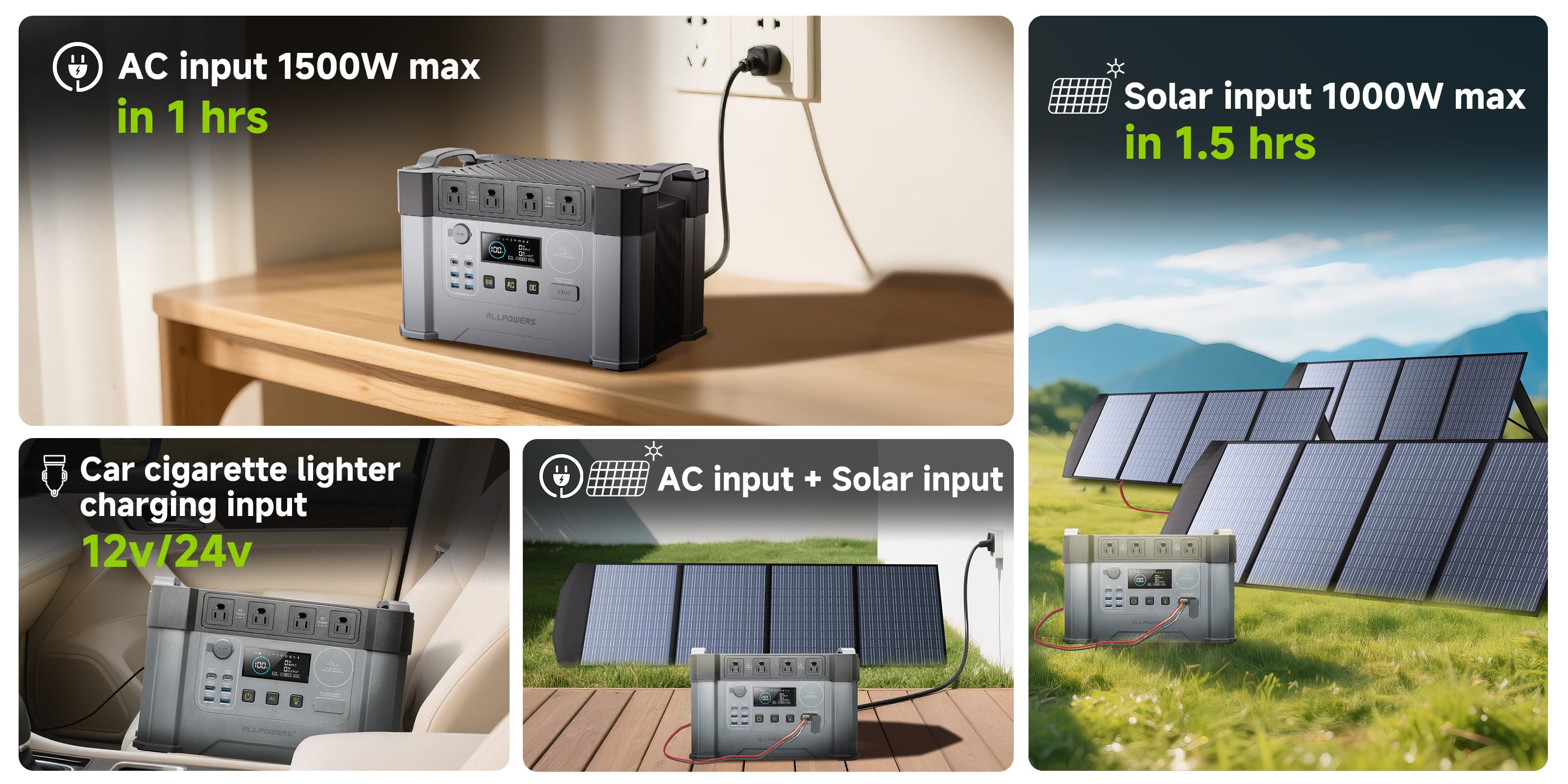 - Recharge from 0-100% in 1.5 Hours(AC+solar input);