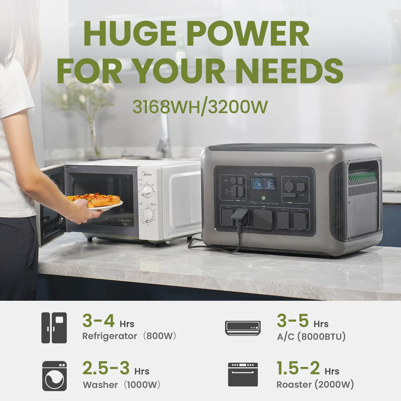 - 3200W Pure Sine Wave Inverter (7000W peak);
