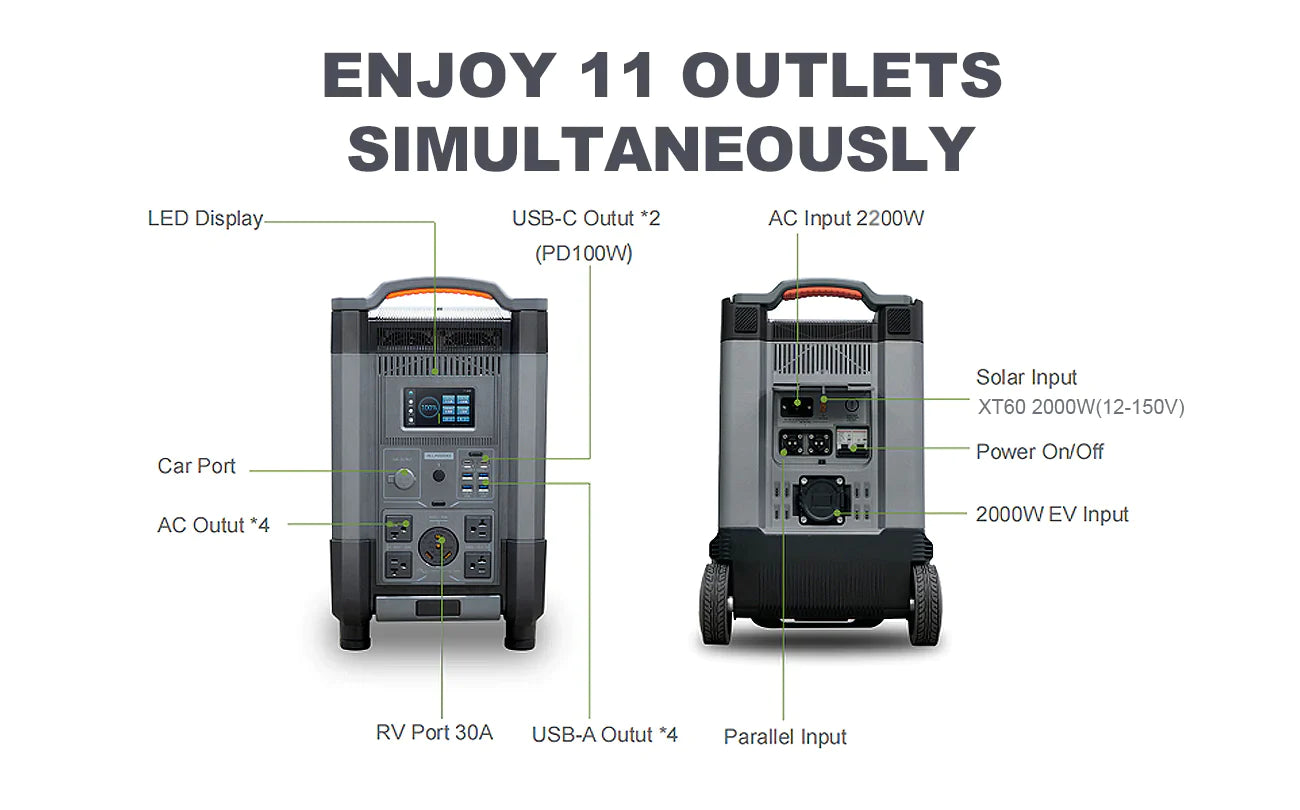 ALLPOWERS R4000 is equipped with one normal output port and one emergency output port.AC output port x 4, USB-C (up to 100W) output port x 2, USB-A (up to 18W) output port x 2, USB-A (up to 12W) output port x 2,Cigarette lighter socket (maximum 120W) output port x 1, RV output port x 1. When hosting a family camp or outdoor event, you can charge everyone's devices at the same time if you have one.