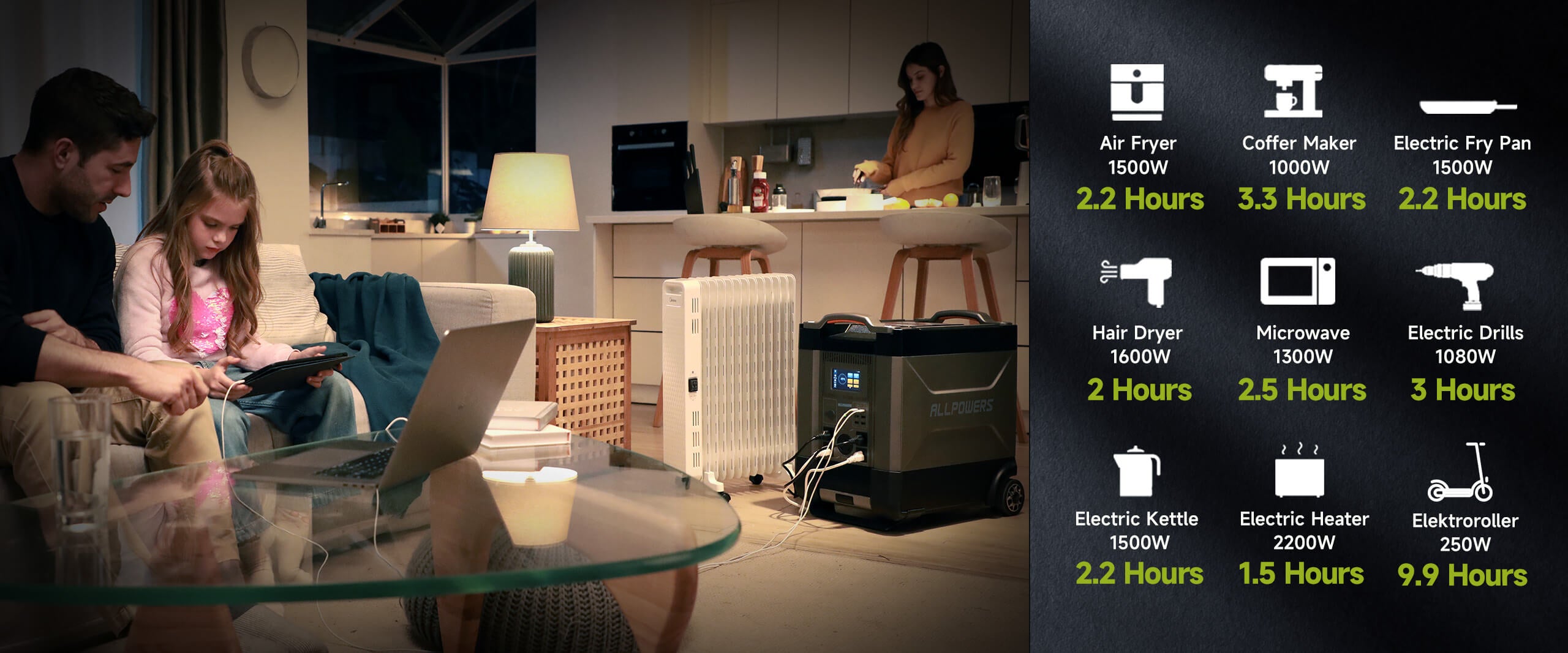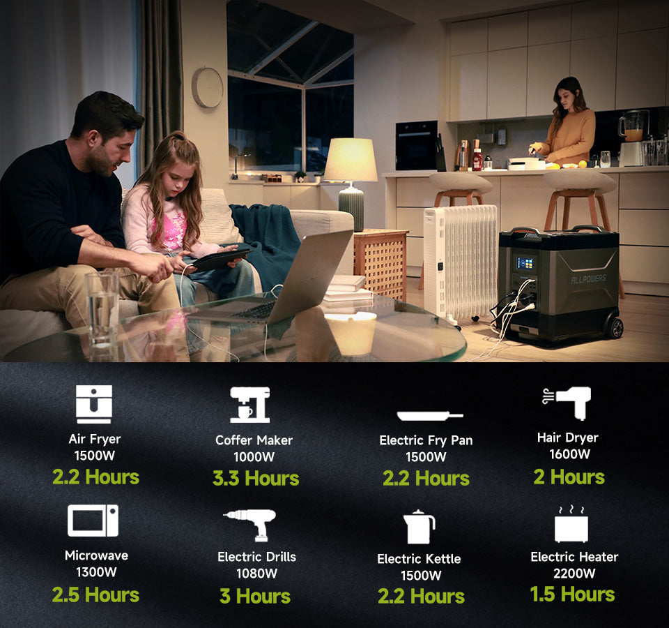 The ALLPOWERS R4000 Portable Power Supply is a simple mobile battery with a high capacity LifeFO4 battery (lithium iron phosphate battery). It has a large output of 3600W, so it goes without saying that it is compatible with many household appliances for outdoor use. Air conditioners (100V specification), electric stoves, electric kettles, electric blankets, washing machines, hair dryers, TVs... We are compatible with all home appliances, so you can use them for hours or more as a countermeasure against power outages. Massu. In recent years, disasters such as typhoon, heavy rain, heavy snow, flood, earthquake,CPAP,RV,and tsunami have become more and more frequent, but with this ALLPOWERS R4000 portable power supply, you can maintain your daily life even if there is a power outage. possible.