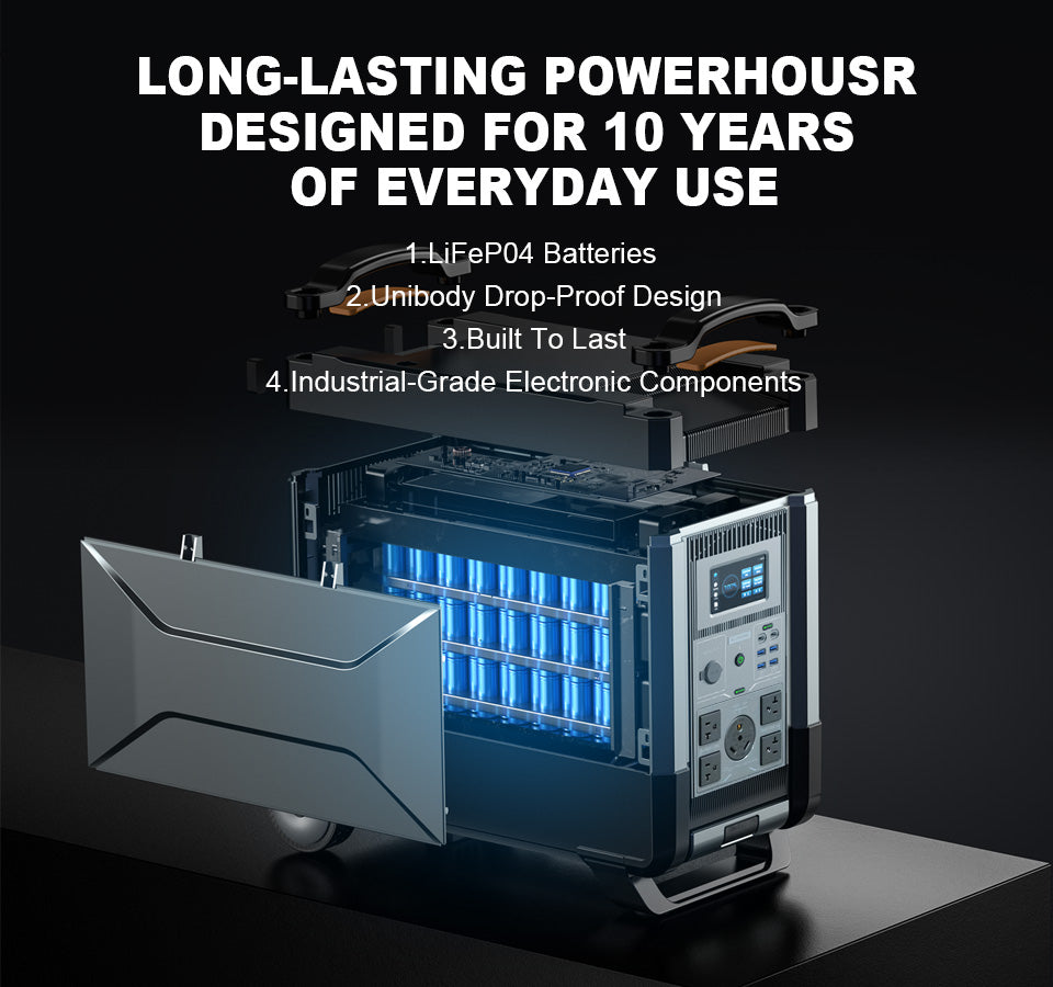 This ALLPOWERS R4000 power station features a LiFePO4 battery. The maximum battery capacity is higher than 80% after 3500 cycles of charging and higher than 50% after 6500 cycles. Therefore, R4000 exceeds the service life of 10 years. It is equipped with three charging modes ( Fast mode/Standard mode/Silent mode ) to meet the needs of different charging environments.
