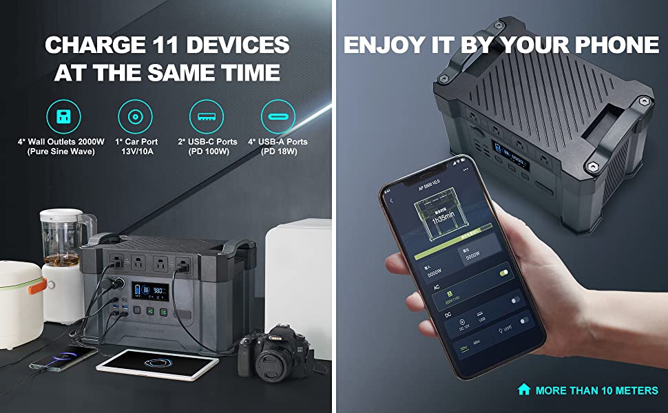 The S2000 comes with a 1500Wh battery pack and has 4* AC outlets (PURE SINE WAVE, 2000W, peak 4000W), 2* PD 100W USB-C ports, 2* USB-A QC3.0 fast charge ports, 2* standard USB-A ports, and 1* Car socket.