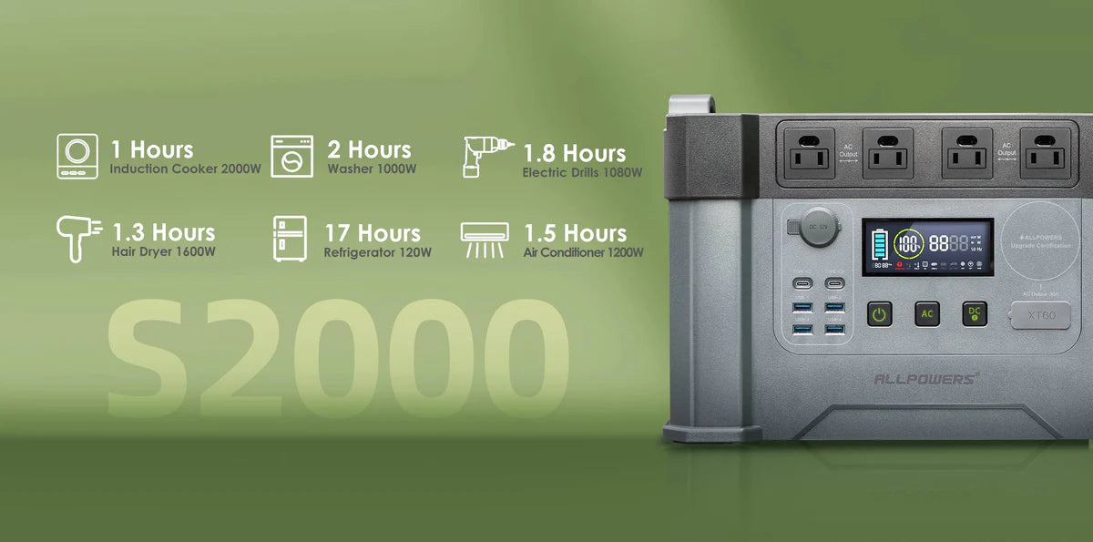 From charging at home to more mobile solutions, we offer four ways to charge your S2000 : AC charging, car charging, solar charging, dual charging (AC+solar),Generator charging.Using XT60 solar input and MPPT advanced technology, an ALLPOWERS solar generator can be recharged in just 3 hours! The portable power battery can also be fully charged indoors in 4 hours using an AC cable . You can charge it up in less than 1.6 hours using dual 900W charging. You can also charge it using your car's 12V or 24V cigarette lighter.