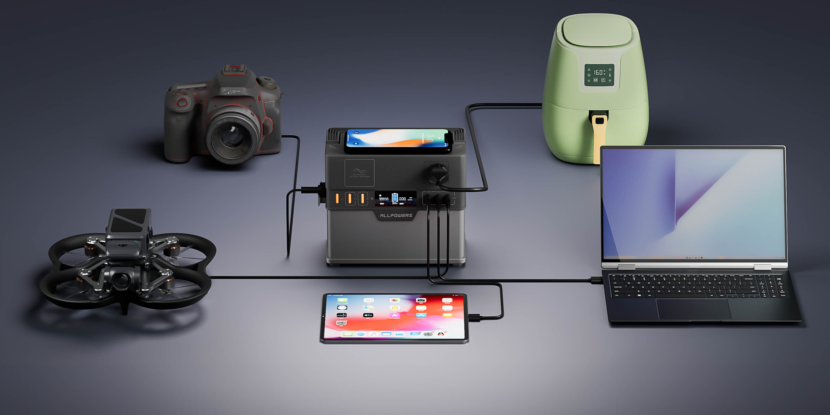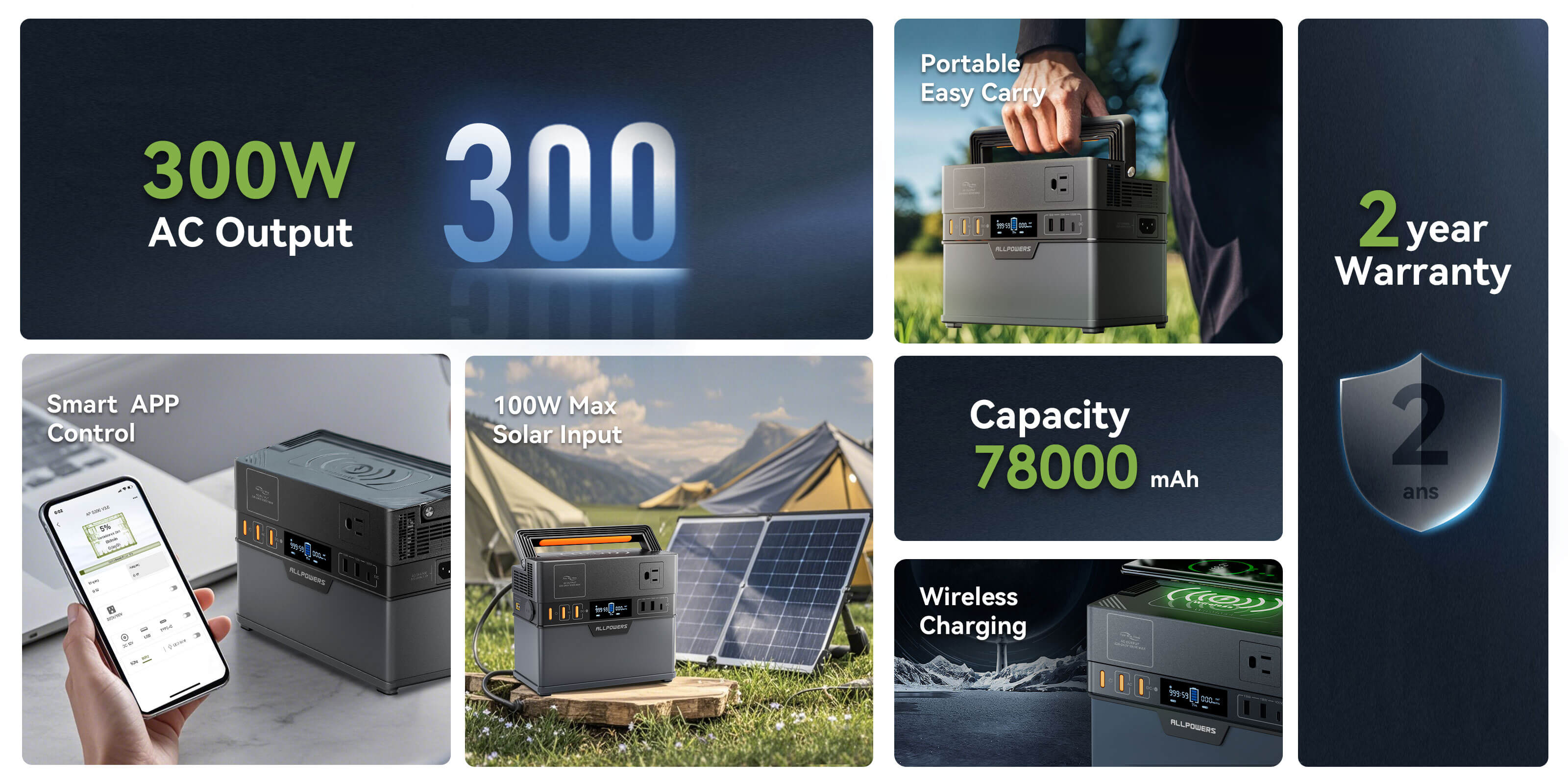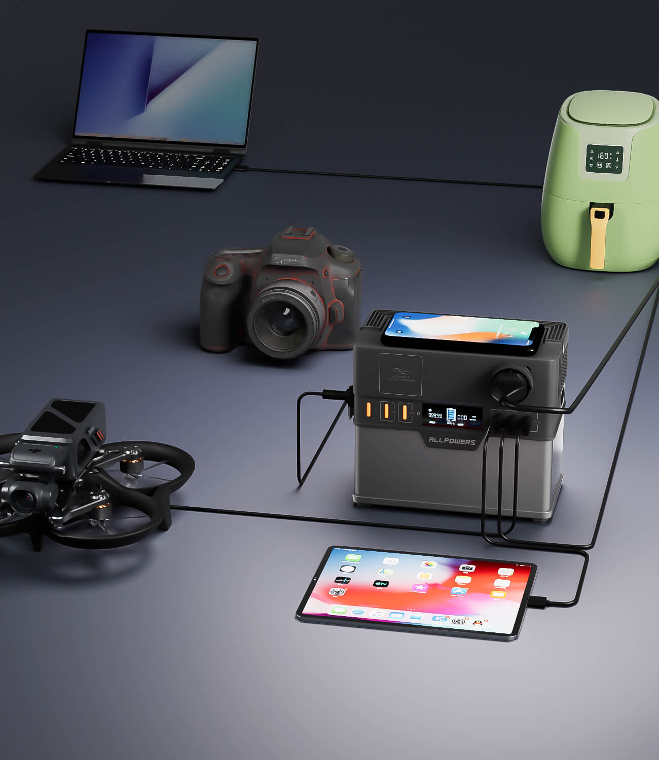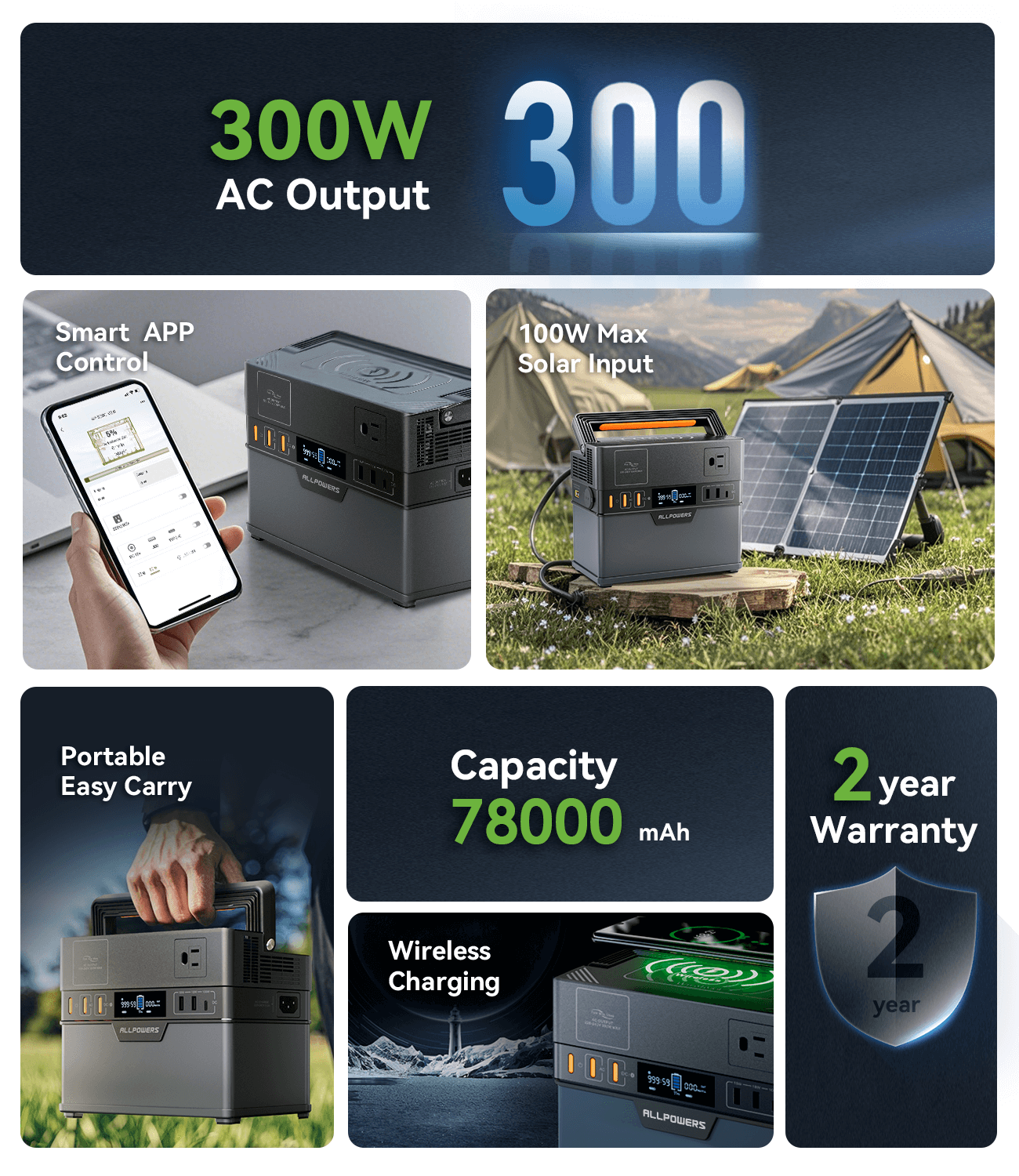 ALLPOWERS S300 Plus portable power station is equipped with a 288 watt-hour battery pack. Portable power source features 1*AC ports (100V-120v), 300W(peak 600w),2*USB-A ports,1*, 1*USB-C ports ,1*Cigarette lighter socket(12V/8.5A) and a wireless charger(5V/1A) at the top. Allpowers portable power station gives you the ports you need to charge all of your devices at the same time.
