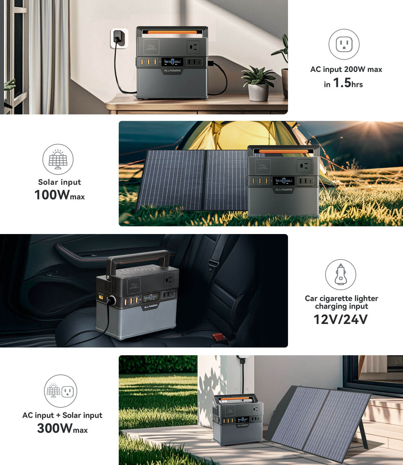 ALLPOWERS Portable Power has 4 ways to charge the emergency battery. It takes 1.5 hours to fully charge the portable power station using an AC 230V wall socket; about 3-4 hours using a solar panel in direct sunlight (100W max); about 3-4 hours using a 12V/24V car cigarette lighter socket; about 1 hour using AC charging and solar panels together (300W max).