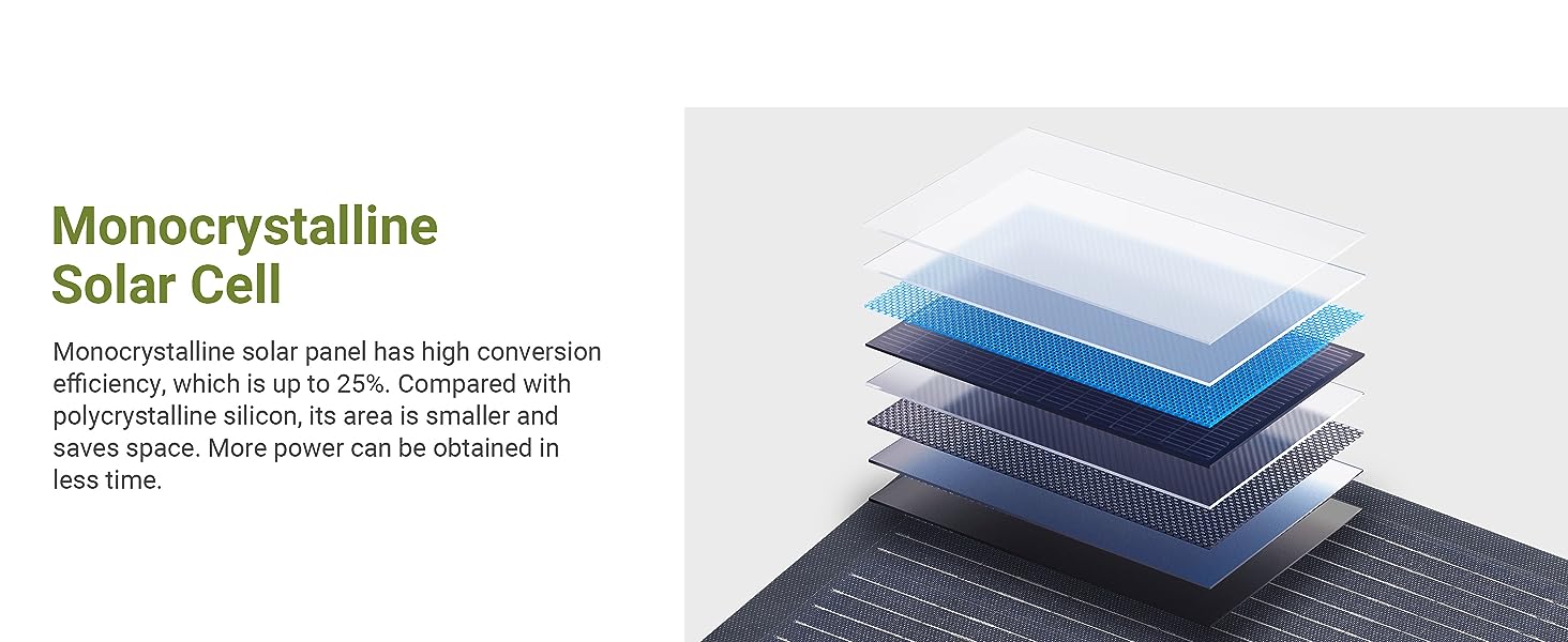 Monocrystalline solar panel has high conversion efficiency, which is up to 25%. Compared with polycrystalline silicon, its area is smaller and saves space. More power can be obtained in less time.