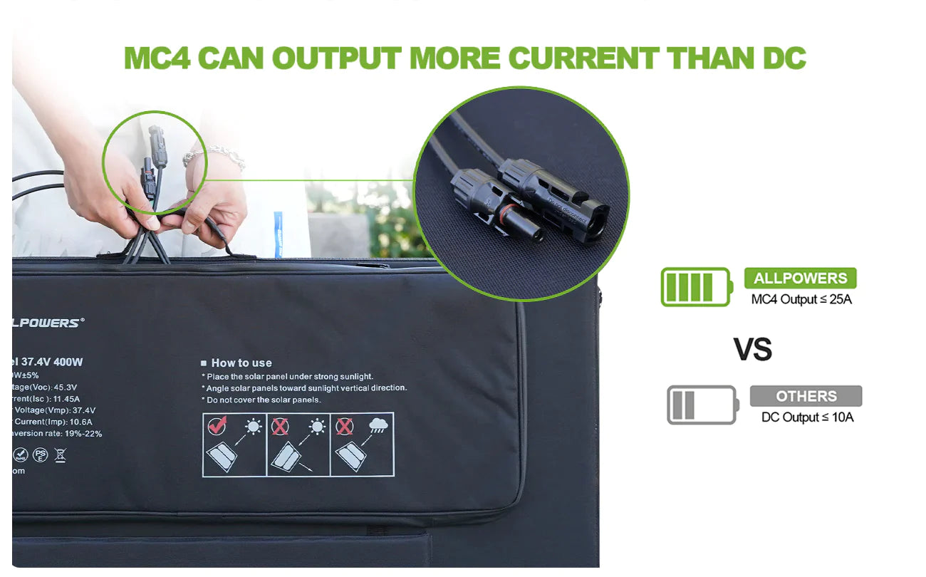 With Solar Connector Output ports, ALLPOWERS 400W solar panel provides 37.4V huge power for your solar generators, such as ALLPOWRS S1500/S2000/S2000 Pro /R4000/R3500/R2500/R1500 and other large generators on the market. Effectively shorten charging time, make you enjoy the sunshine energy as soon as possible.